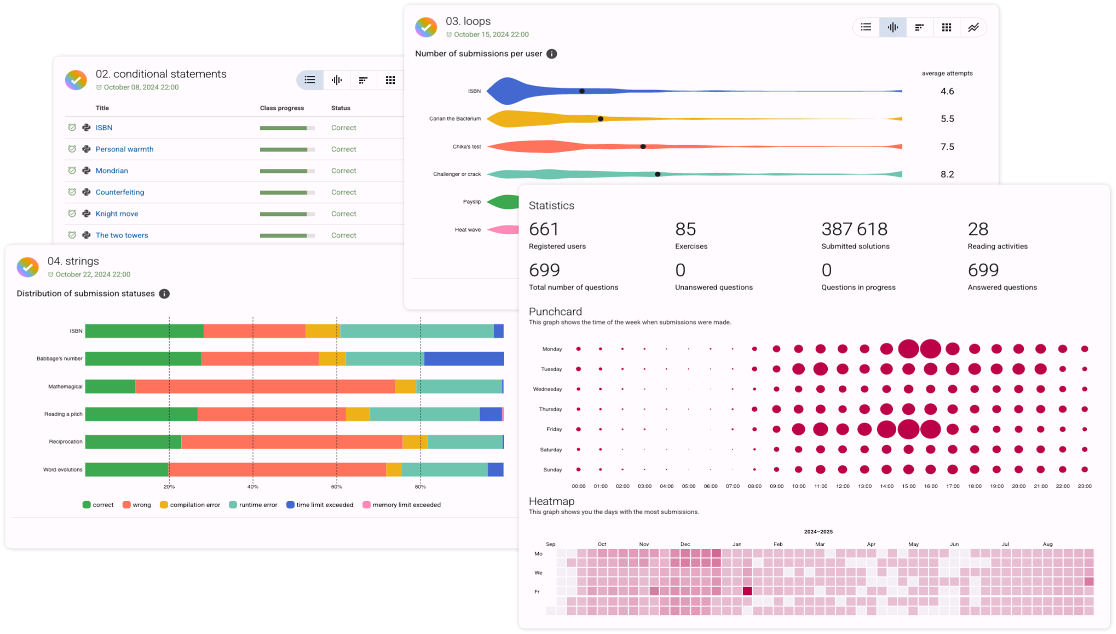 Dodona transforms programming education into a feedback-rich experience that helps students learn smarter. As an online co‑teacher, it keeps teachers at the center by automating routine tasks, and providing data-driven insights. This frees up time to focus on deeper, more targeted student support.