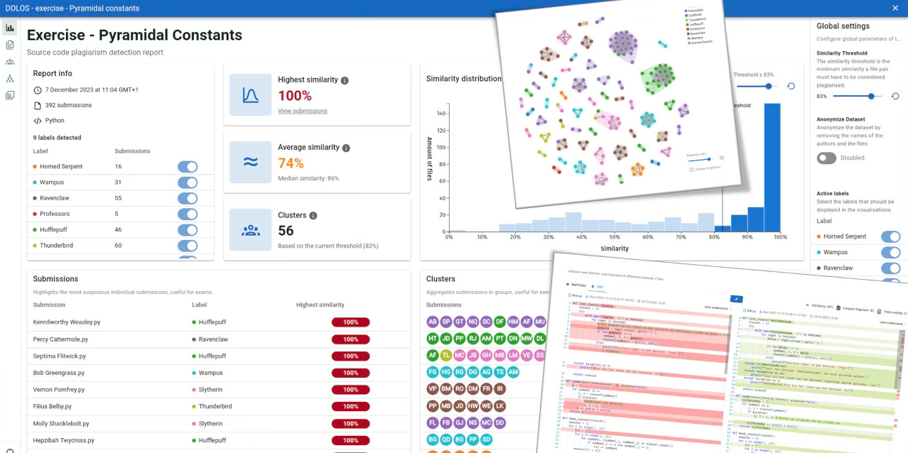 Teachers can create and assess exams and high-stakes tests with Dodona. The platform includes a built-in plagiarism detection tool, enabling teachers to monitor collaboration patterns and ensure academic integrity, giving them confidence in the results.