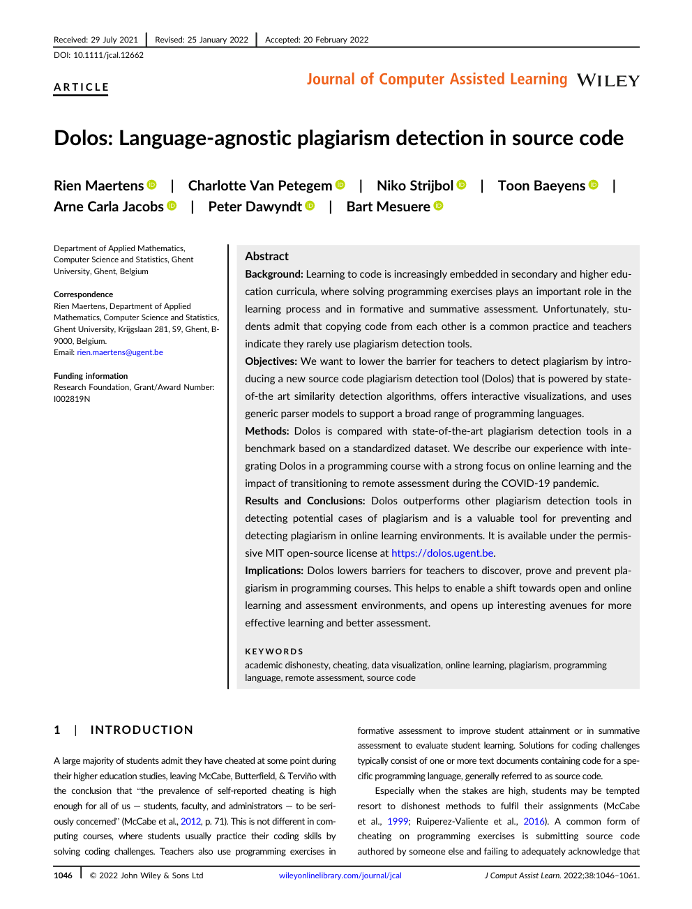 Maertens, R., Van Petegem, C., Strijbol, N., Baeyens, T., Jacobs, A. C., Dawyndt, P., & Mesuere, B. (2022). Dolos: Language-agnostic plagiarism detection in source code. Journal of Computer Assisted Learning. https://doi.org/10.1111/jcal.12662