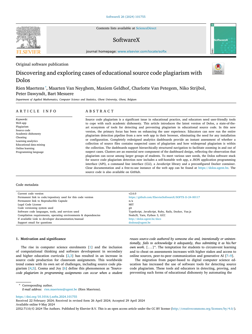 Maertens, R., Van Neyghem, M., Geldhof, M., Van Petegem, C., Strijbol, N., Dawyndt, P., Mesuere, B., 2024. Discovering and exploring cases of educational source code plagiarism with Dolos. SoftwareX 26, 101755. https://doi.org/10.1016/j.softx.2024.101755