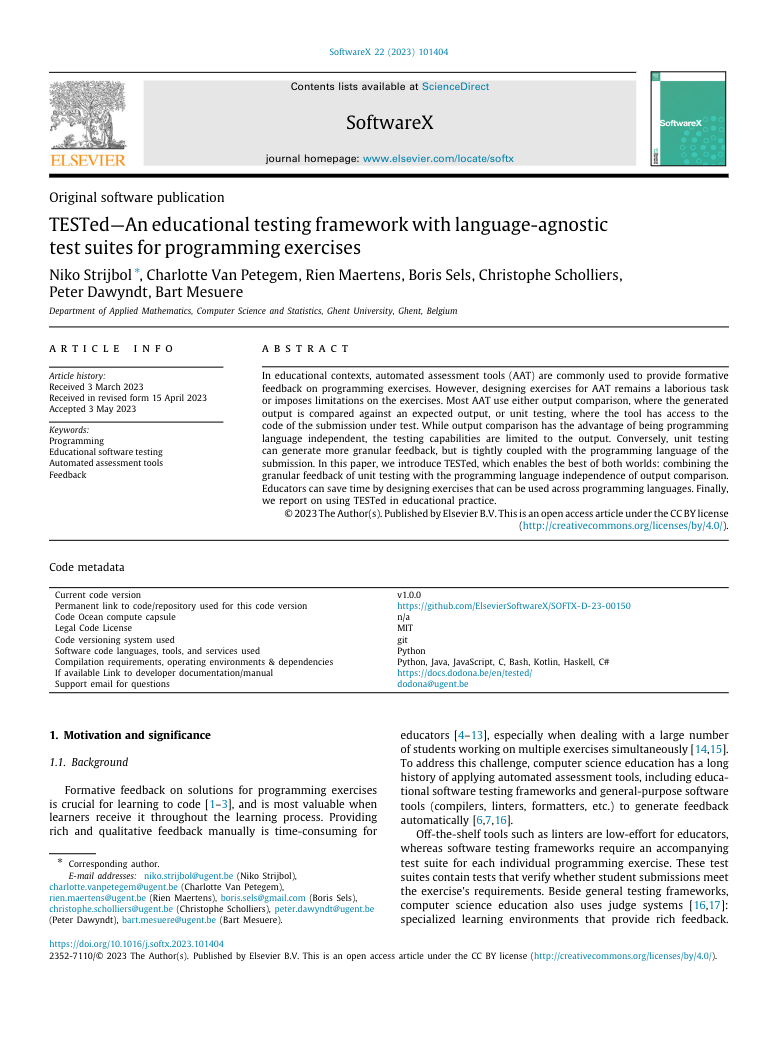 Strijbol, N., Van Petegem, C., Maertens, R., Sels, B., Scholliers, C., Dawyndt, P., & Mesuere, B. (2023). TESTed—An educational testing framework with language-agnostic test suites for programming exercises. SoftwareX, 22, 101404. https://doi.org/10.1016/j.softx.2023.101404