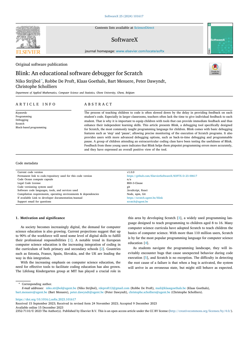 Strijbol, N., De Proft, R., Goethals, K., Mesuere, B., Dawyndt, P., & Scholliers, C. (2024). Blink: An educational software debugger for Scratch. SoftwareX, 25. https://doi.org/10.1016/j.softx.2023.101617.