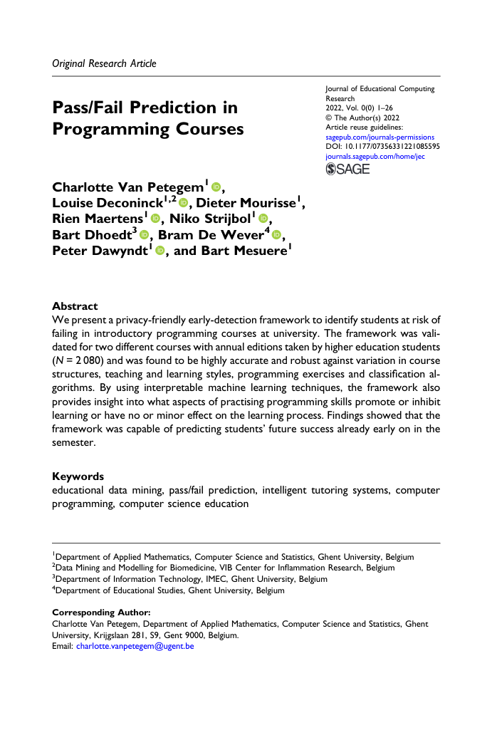 Van Petegem, C., Deconinck, L., Mourisse, D., Maertens, R., Strijbol, N., Dhoedt, B., De Wever, B., Dawyndt, P., & Mesuere, B. (2022). Pass/Fail Prediction in Programming Courses. Journal of Educational Computing Research, 68–95. https://doi.org/10.1177/07356331221085595
