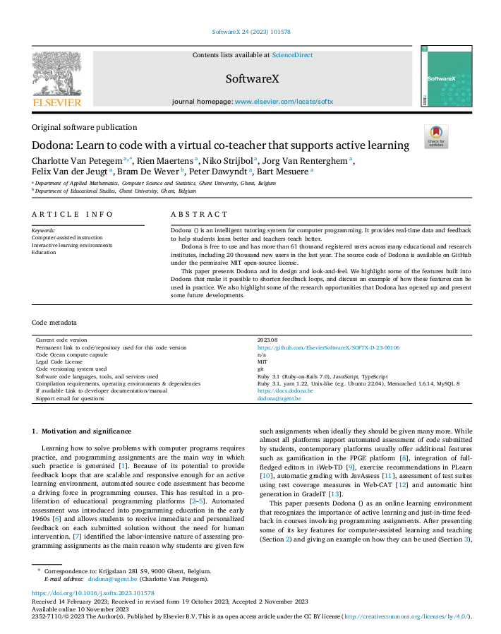 Van Petegem, C., Maertens, R., Strijbol, N., Van Renterghem, J., Van der Jeugt, F., De Wever, B., Dawyndt, P., & Mesuere, B. (2023). Dodona: Learn to code with a virtual co-teacher that supports active learning. SoftwareX, 24, 101578. https://doi.org/10.1016/j.softx.2023.101578