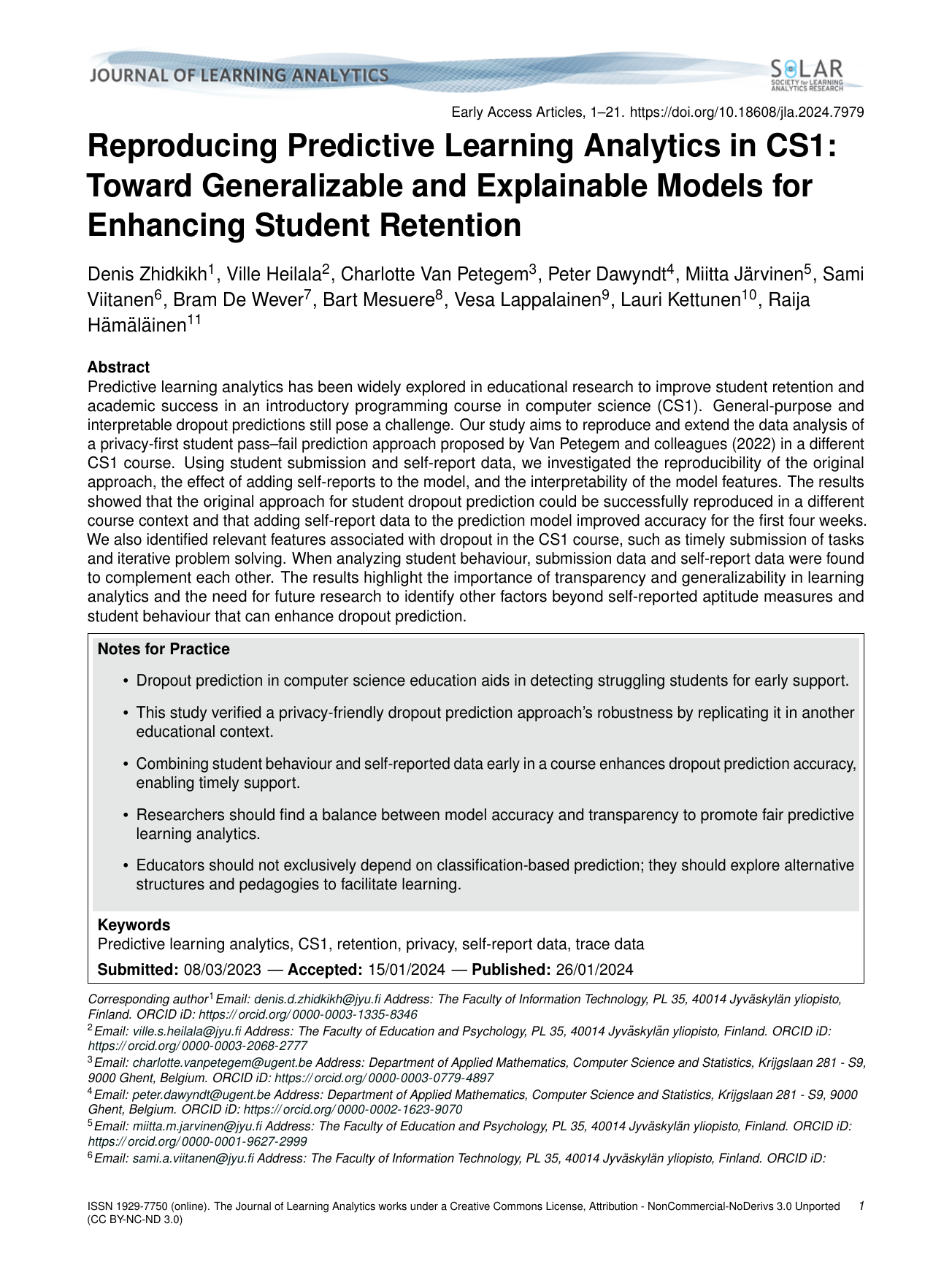 Zhidkikh, D., Heilala, V., Van Petegem, C., Dawyndt, P., Järvinen, M., Viitanen, S., De Wever, B., Mesuere, B., Lappalainen, V., Kettunen, L., & Hämäläinen, R. (2024). Reproducing Predictive Learning Analytics in CS1: Toward Generalizable and Explainable Models for Enhancing Student Retention. Journal of Learning Analytics, 1–21. https://doi.org/10.18608/jla.2024.7979